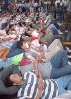 줄을 맞춰 고개를 숙이고 앉아 있는 구로구 부정선거 농성 학생들