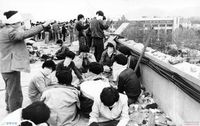 성남에서 열린 노태우 대통령 후보 유세장에서 대학생들이 반대 시위를 하는 모습