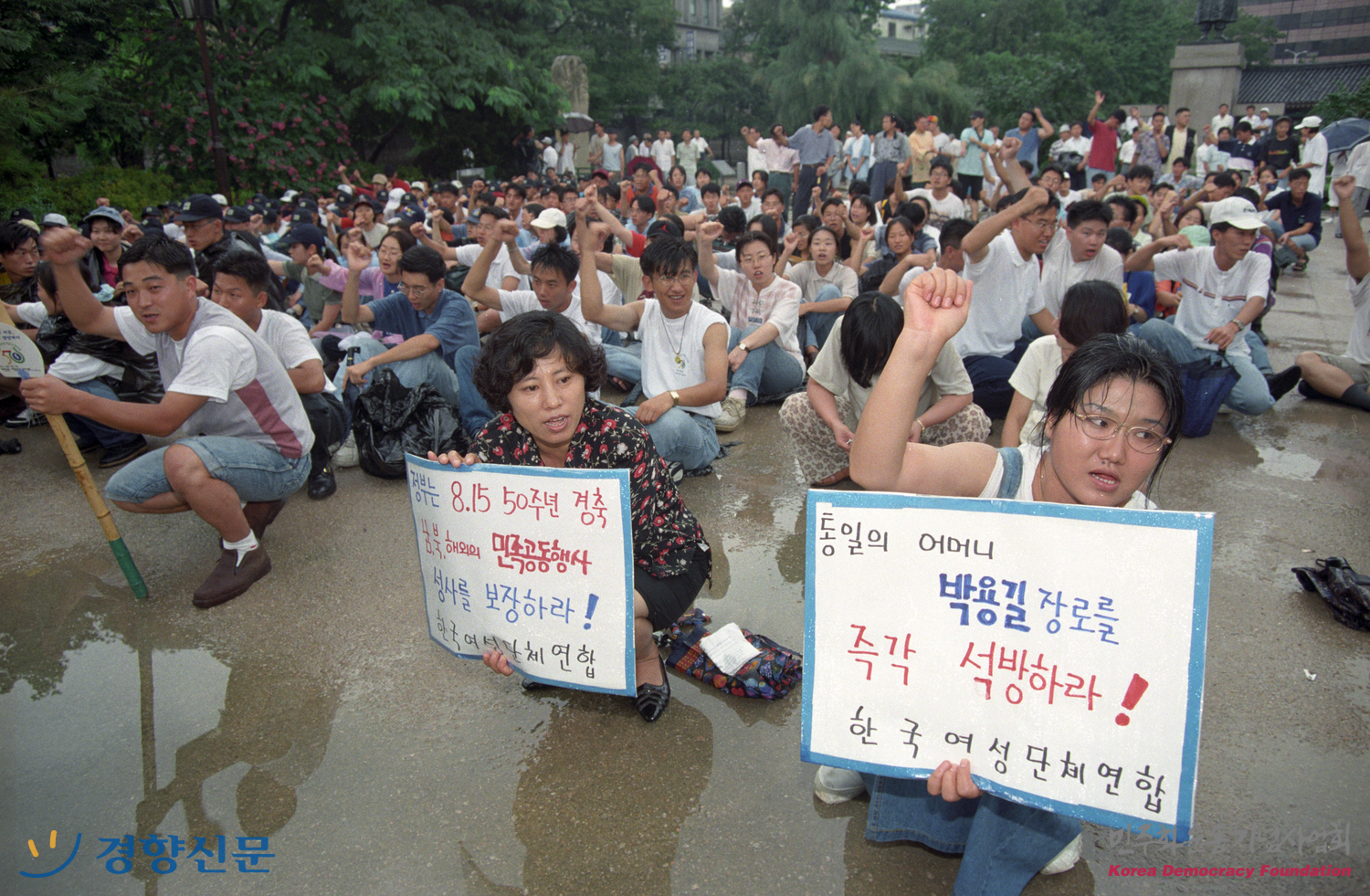 8.15 민족공동행사 성사와 박용길장로 석방을 요구하는 구호를 외치는 사람들