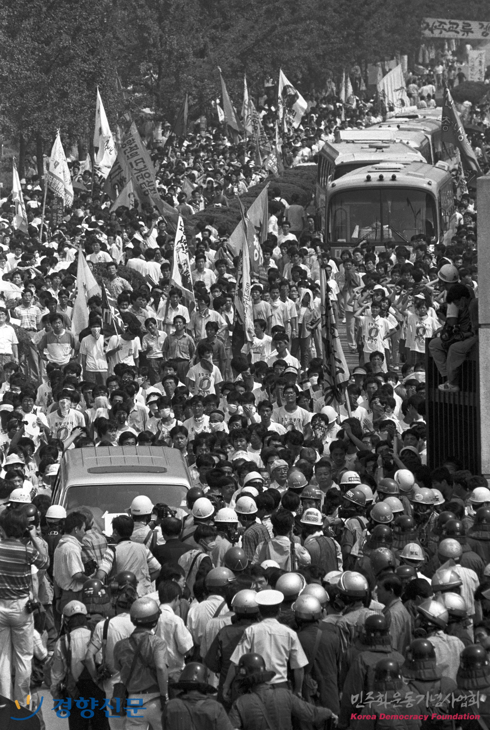 연세대에서 나오려는 버스와 사람들을 막고 있는 전투경찰들