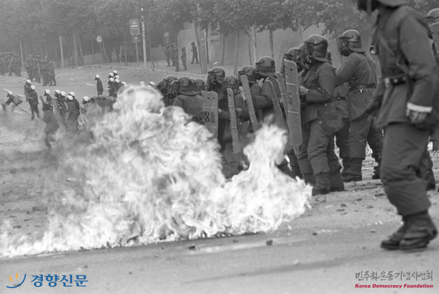 연세대 앞 화염병으로 인한 불길을 방패로 막고 있는 전경들