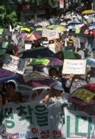 상복을 입고 쌀 개방 반대시위에 참석한 농민들의 모습