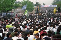 쌀 포대를 입고 쌀 수입 개방 반대 시위하는 시위대