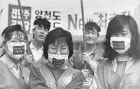 쌀과 기초농산물 수입 개방 저지와 국민투표실시 촉구 결의대회를 갖고 가두 행진하는 시민들