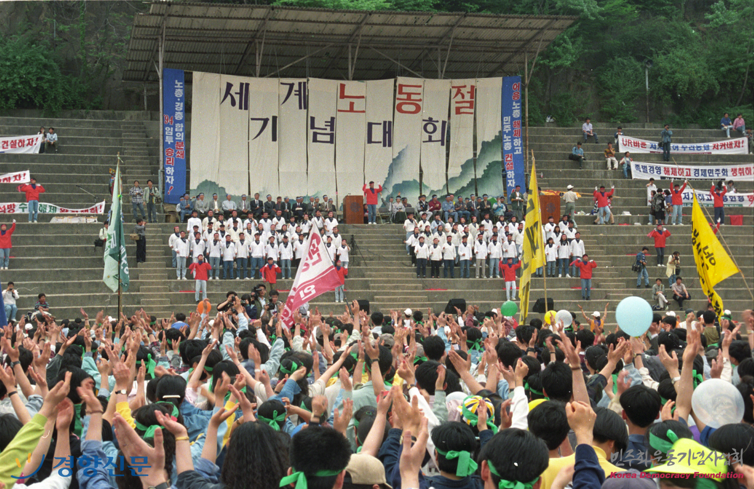 세계노동절기념대회가 열린 고려대에서 손을 높이 들어 박수치는 수많은 노동자