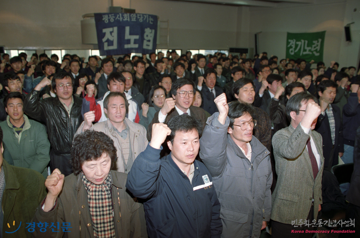 94년 임투승리를 위한 단위노조대표자결의대회에서 승리를 다지는 노동자들