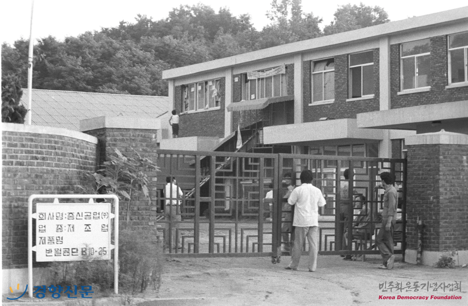 충신공업 공장부지 밖에서 농성장을 바라보고 있는 사람들