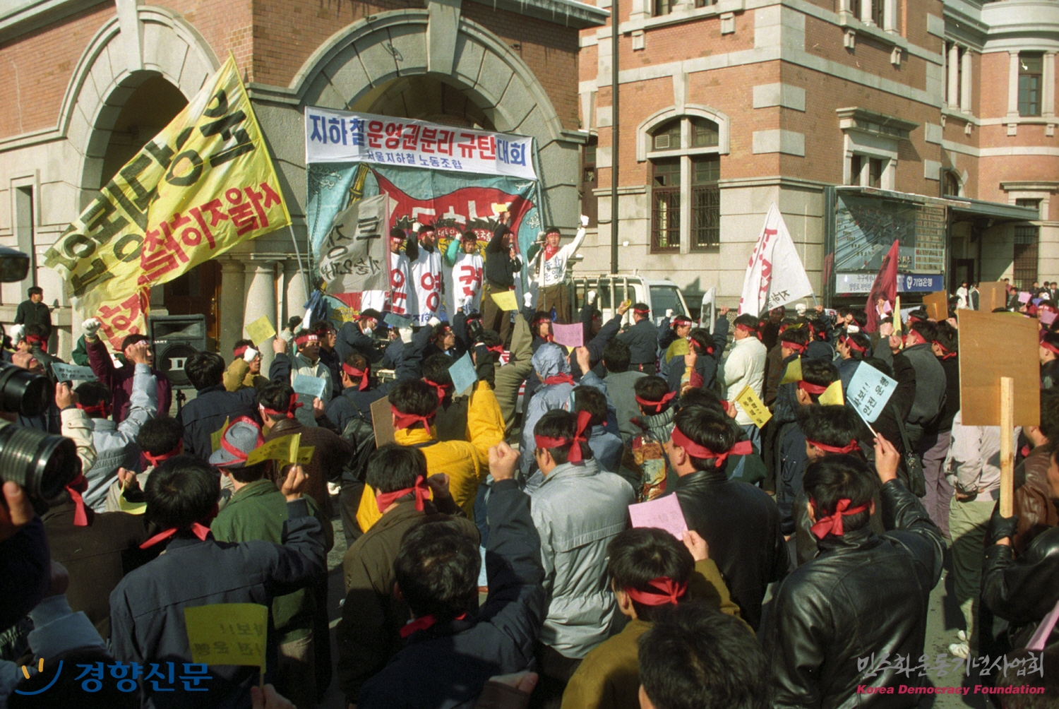 서울지하철 노동조합의 지하철 분리운영 반대 결의대회에서 투쟁하는 노동자들