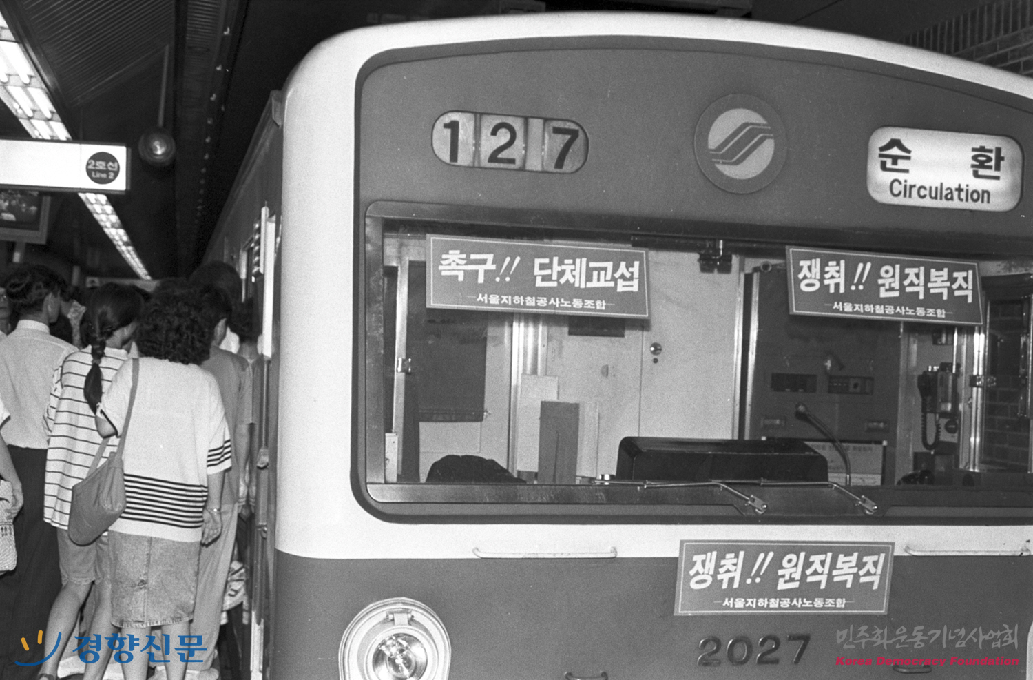 지하철 노조의 격문이 붙어있는 지하철 전동차