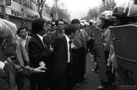 장애인 노점상 최정환의 영결식을 갖고 가두 행진하려는 연세대 학생들을 막기 위해 시위진압대가 발포한 최루가스로 가득 찬 연세대 앞