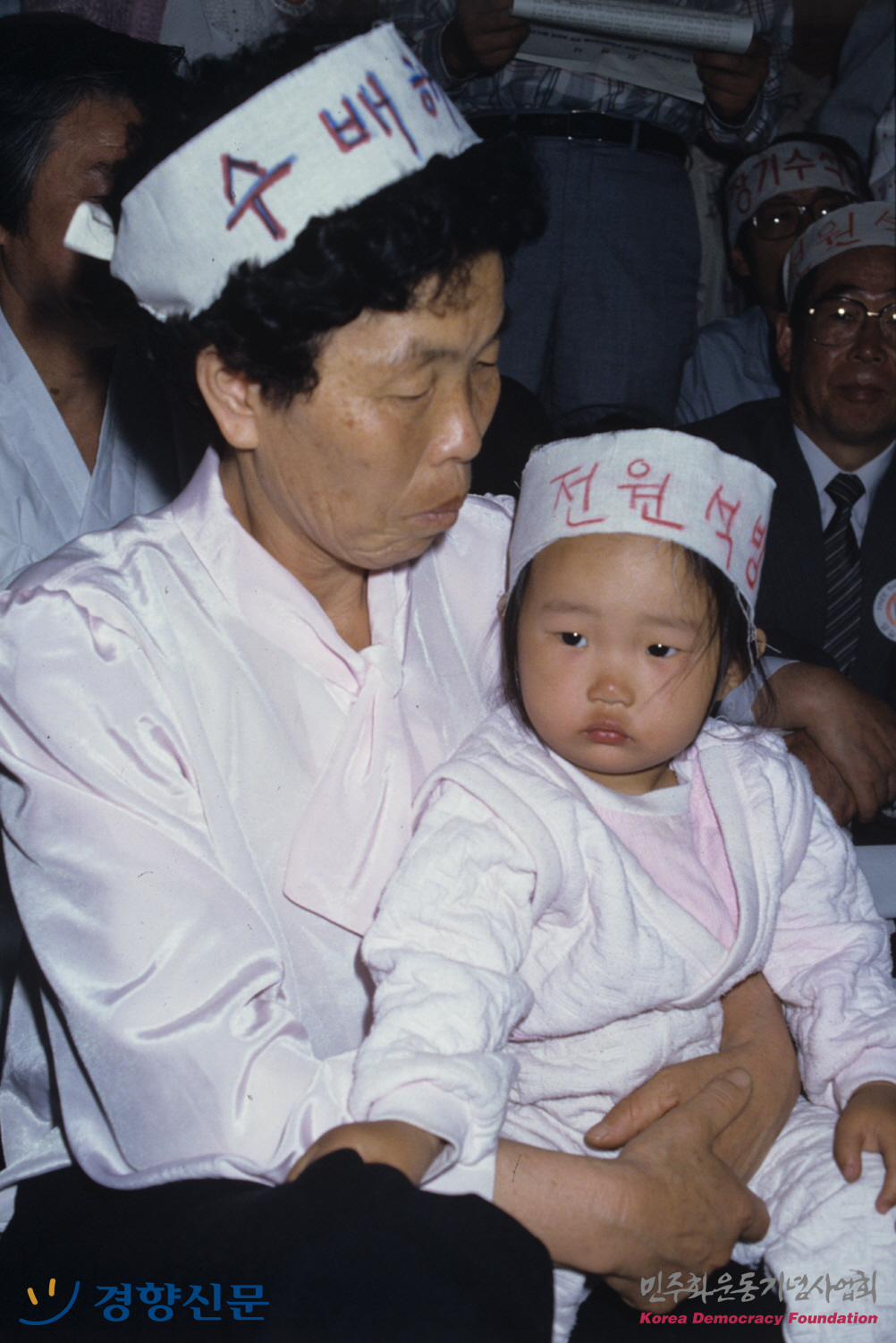 "양심수 특위" 를 구성하여 양심수 전원석방을 요구하며 무기한 농성중인 할머니 품에 안겨있는 아이의 모습