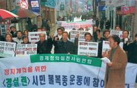 스크럼을 짜고 개헌추진 가두행진을 하는 신민당. 인천