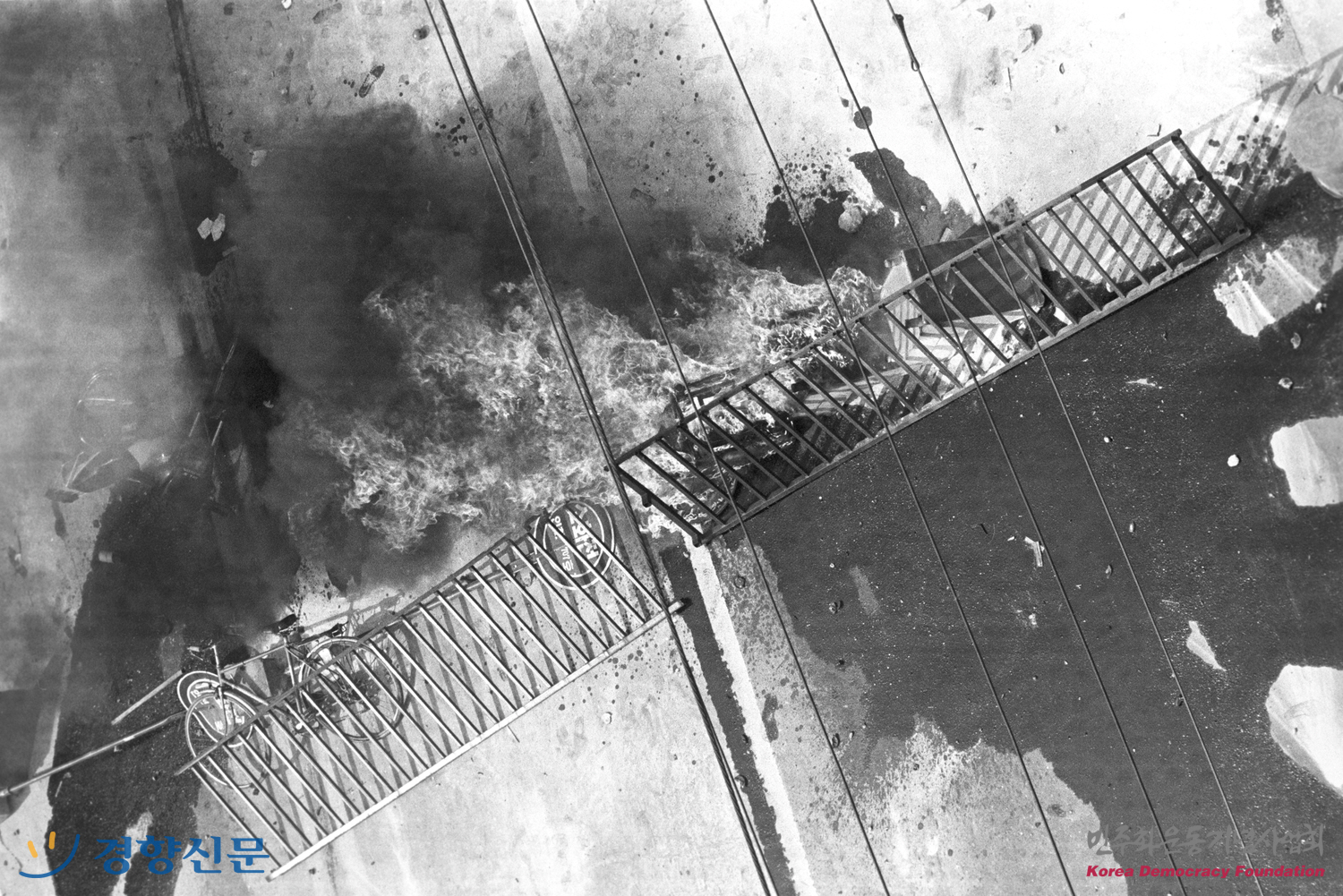 격렬한 시위로 인해 불에 타고 있는 거리의 모습