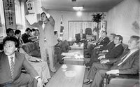신민당 개헌추진대회 저지시위를 벌이고 있는 5.3 인천 항쟁 현장에서 투석하며 진압경찰에게 격렬하게 저항하는 시위자들
