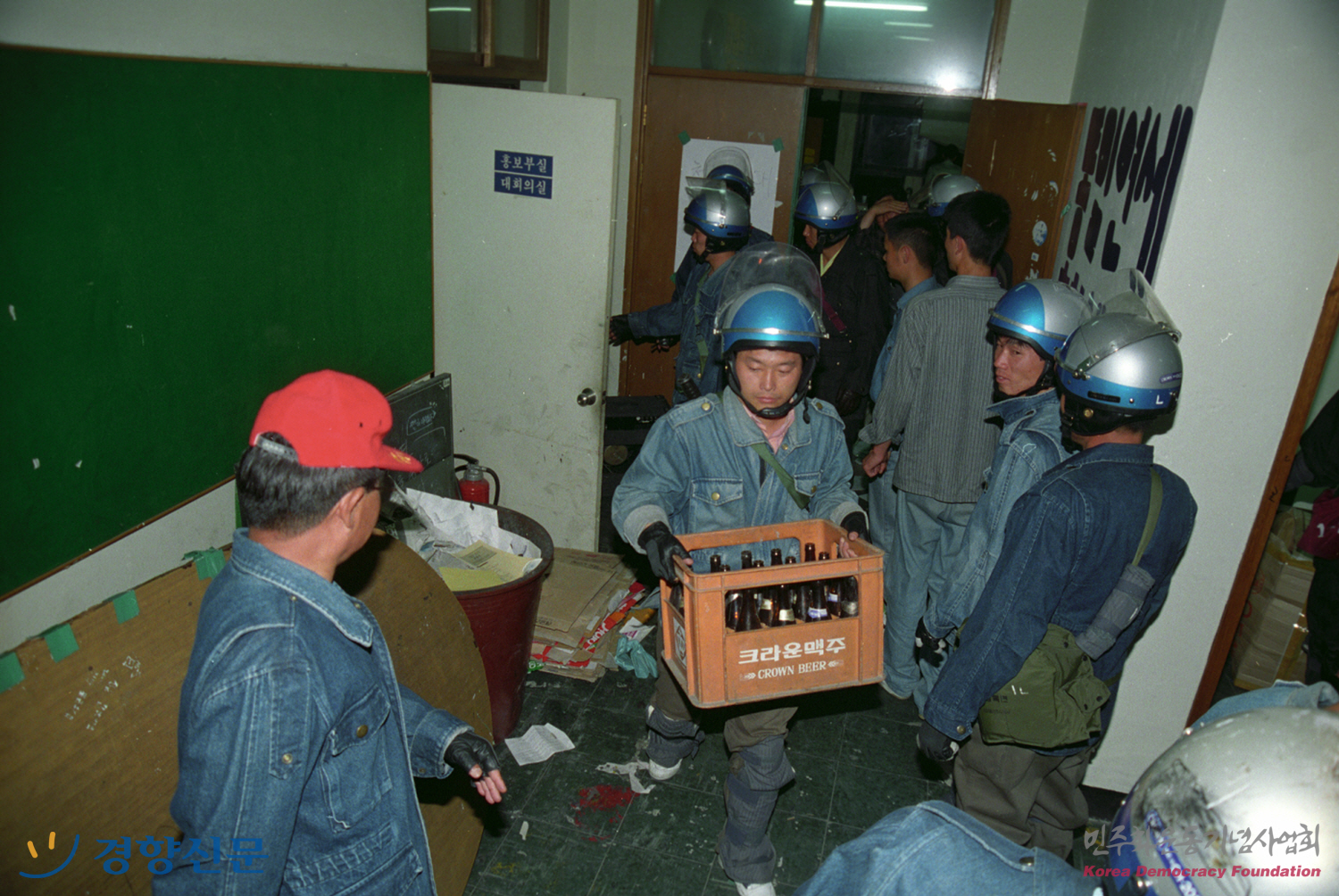 연대 학생회관에서 압수수색으로 발견한 화염병을 나르고 있는 모습
