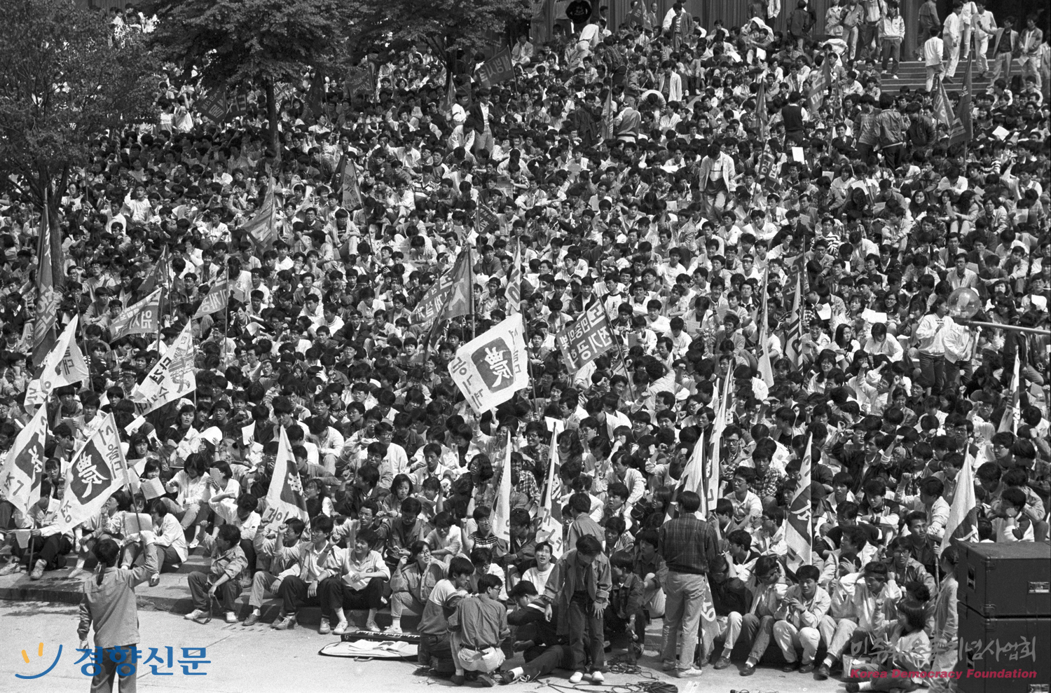 수백만 학도들이 민자당 일당독재에 반발하여 동맹휴업에 들어간 모습
