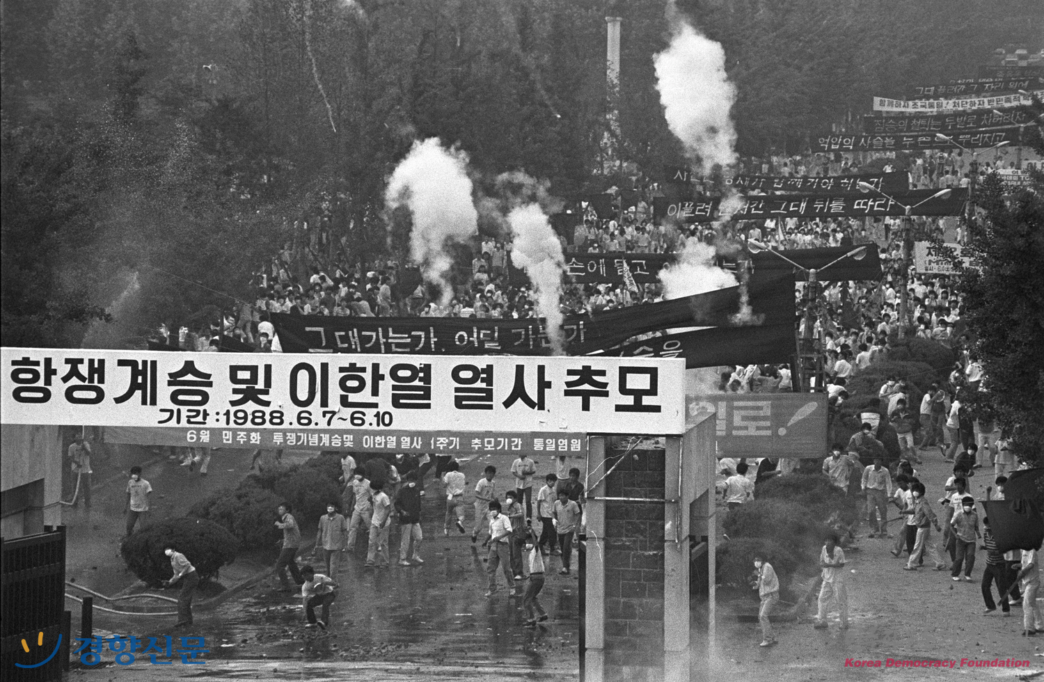 시위를 벌이고 있는 학생들을 향해 최루탄이 발사된 모습
