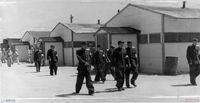 고개를 숙이고 일렬로 늘어서서 경찰에 연행되고 있는 건국대학교 점거농성 학생들의 모습