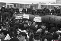 시위 도중 숨진 김귀정의 장례식에 참석한 학생들