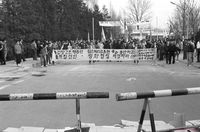 강경대의 노제에서 노태우 정권 타도를 외치며 시위하는 학생들이 최루가스를 피해 뛰어가는 모습