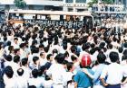 학생들이 깃발을 들고 문익환 목사 장례운구행렬 뒤를 따라 행진하는 모습
