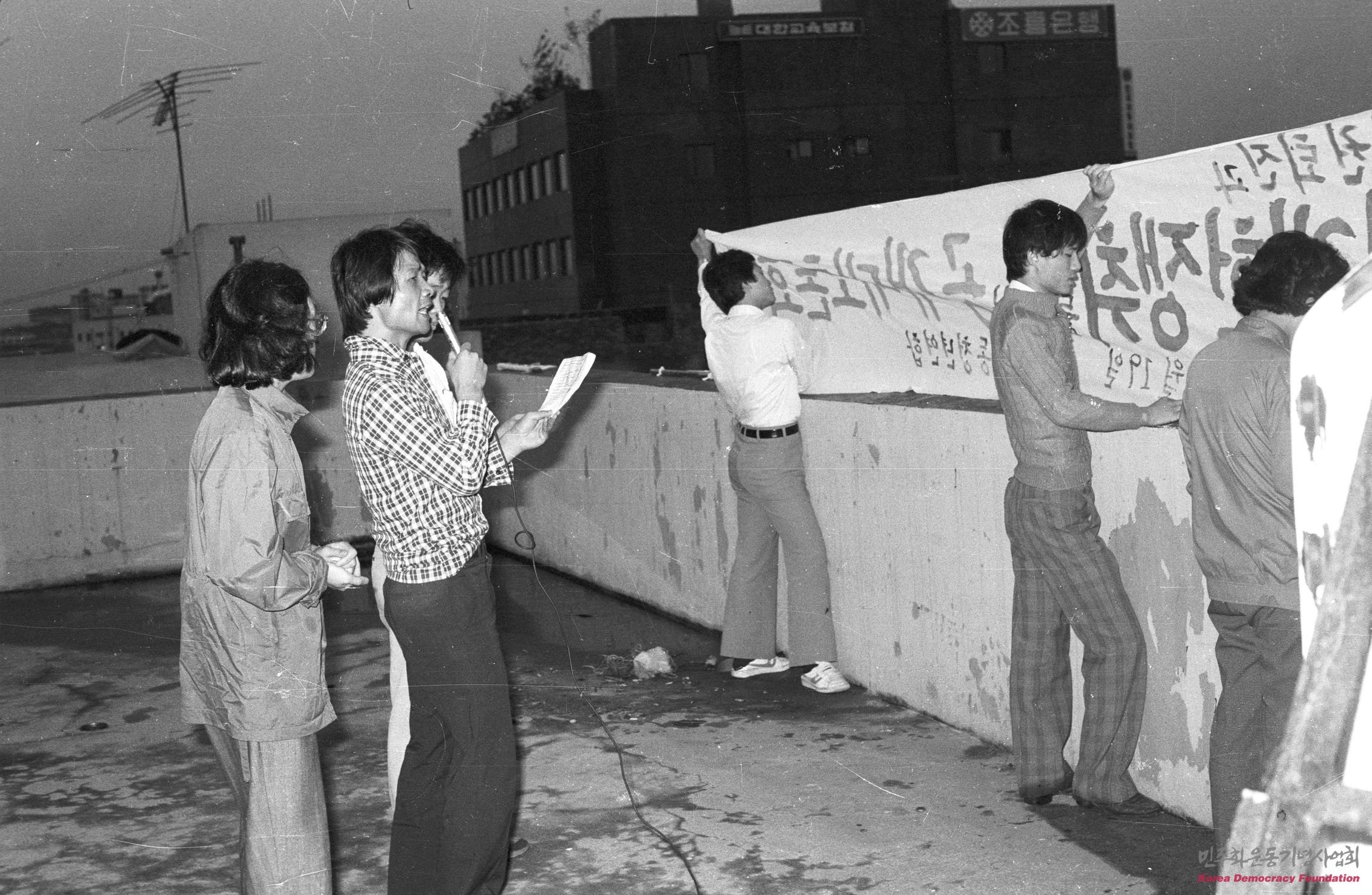 건물 옥상에서 민주제개헌쟁취를 행인들에게 선전하는 토론회 참가자들