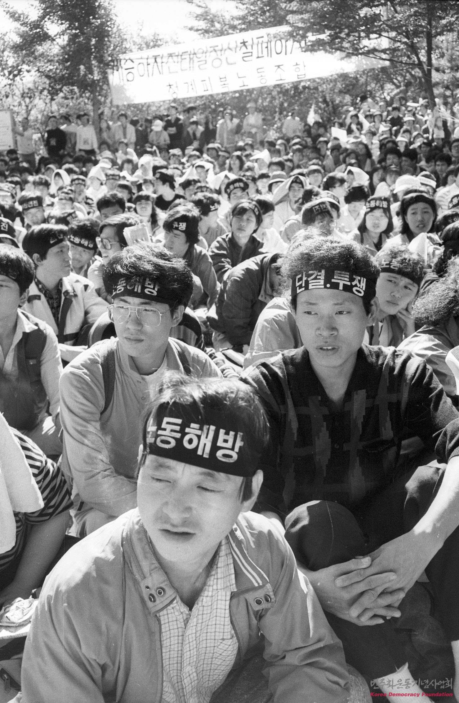 머리에 띠를 두르고 참가한 노동자들의 모습