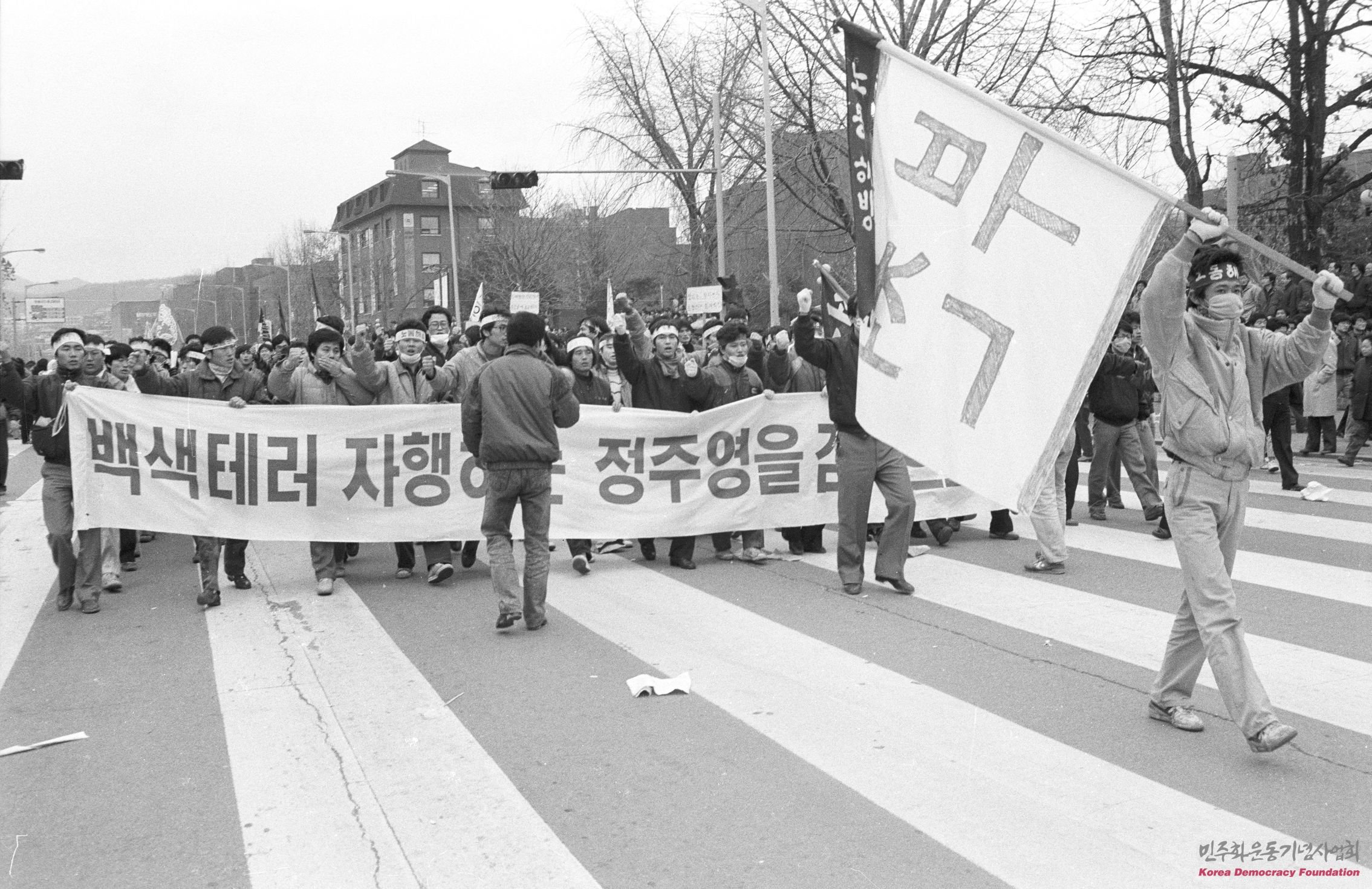 백색테러 자행하는 정주영을 감옥으로라는 현수막을 들고 가두행진을 벌이는 현대노조 노조원들과 시위 참가자들