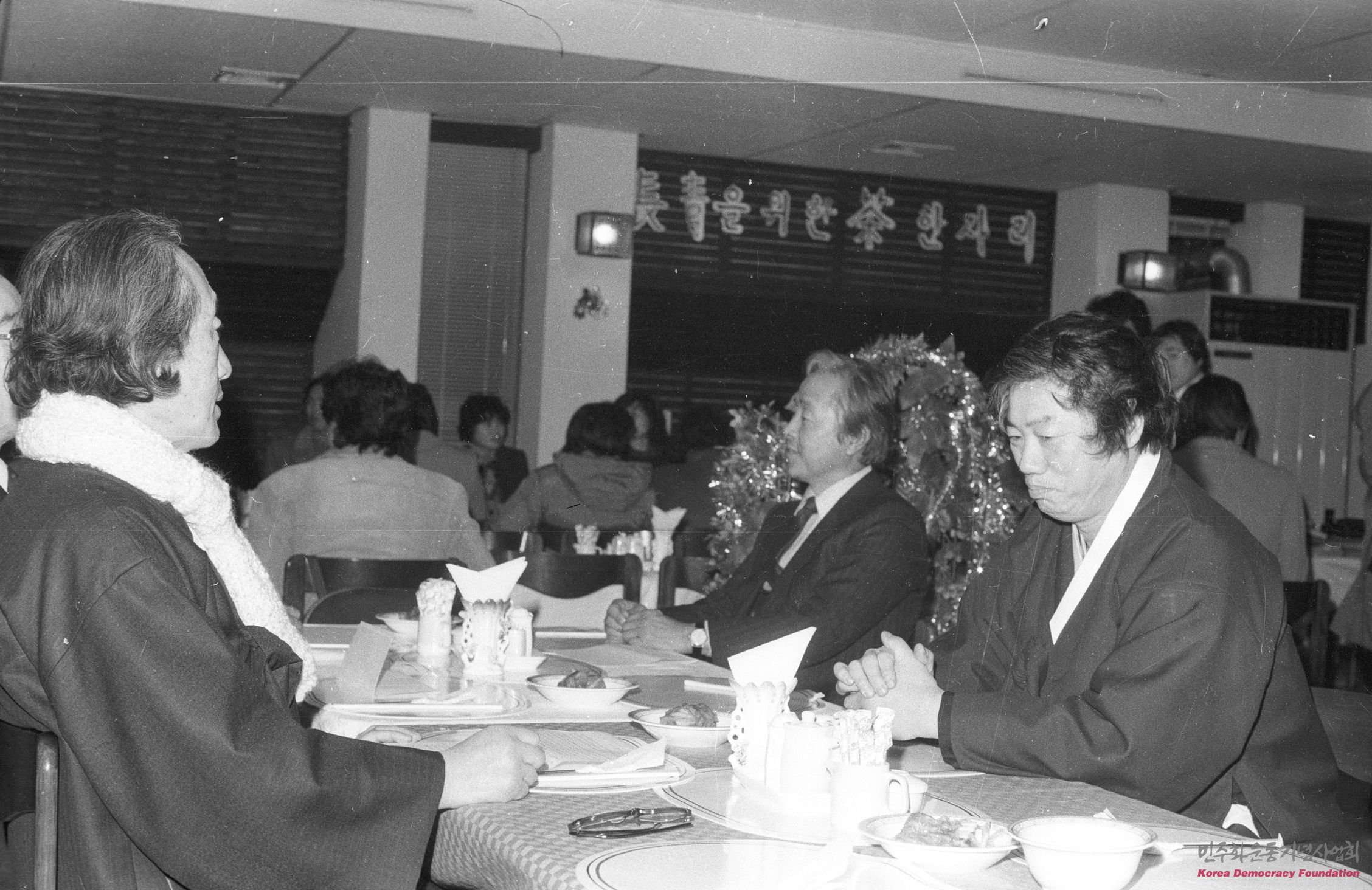 성탄기념 조찬기도회에서 한 테이블에 앉은 문익환, 백기완, 김영삼