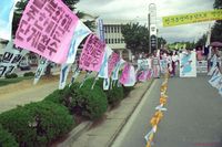 이한열 열사 시청 앞 노제 도중 참가자들이 붙인 대자보와 민주화를 요구하는 글귀들