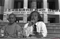거국중립내각실천대회에서 참석자들을 향해 손을 흔드는 문익환