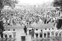 부정선거 규탄 성명서를 읽고 있는 문익환 민통련 의장