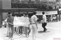 김근태, 인재근 캐네디상 수상식에서 양심수 석방을 요구하며 피켓을 들고 있는 민가협 회원들