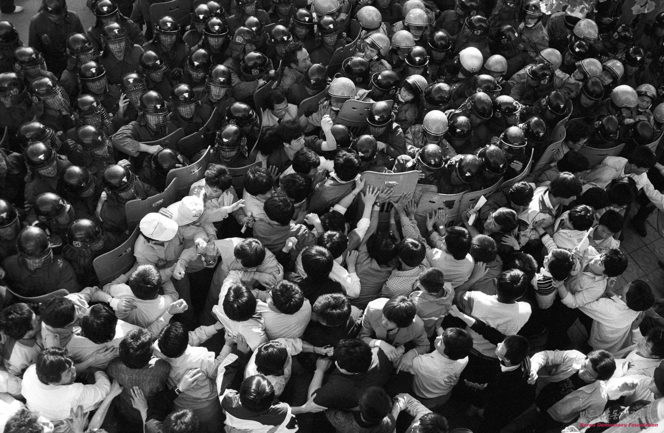 이철규 열사 의문사에 분노한 시민, 학생들의 행진을 봉쇄하려는 전경들