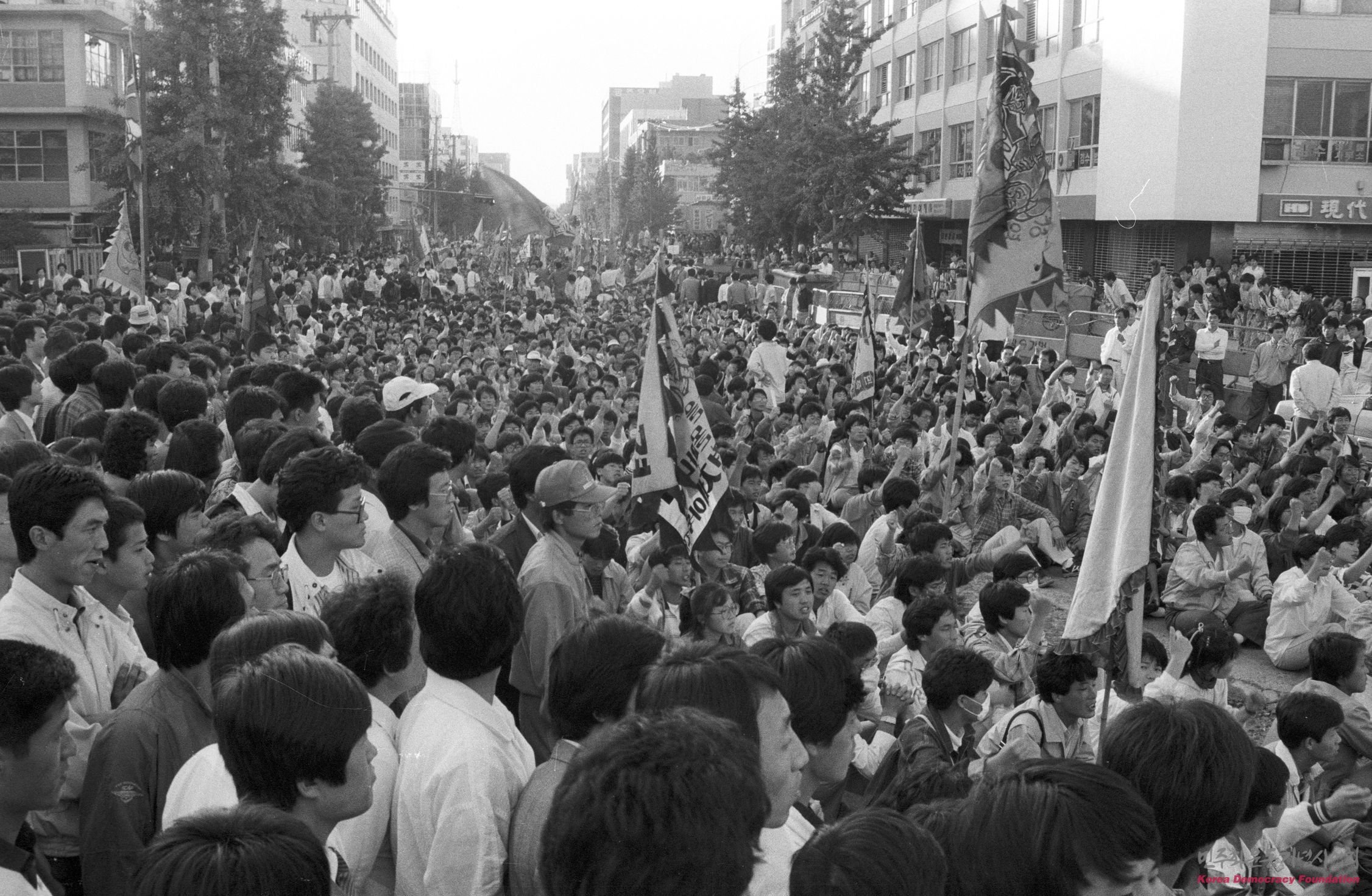 광주 시내의 도로를 점거한 채 농성을 벌이는 광주민중항쟁계승 국민대회 참가자들