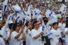 단국대 대동제에서 통일을 상징하는 걸개그림과 전통의상의 신랑 신부