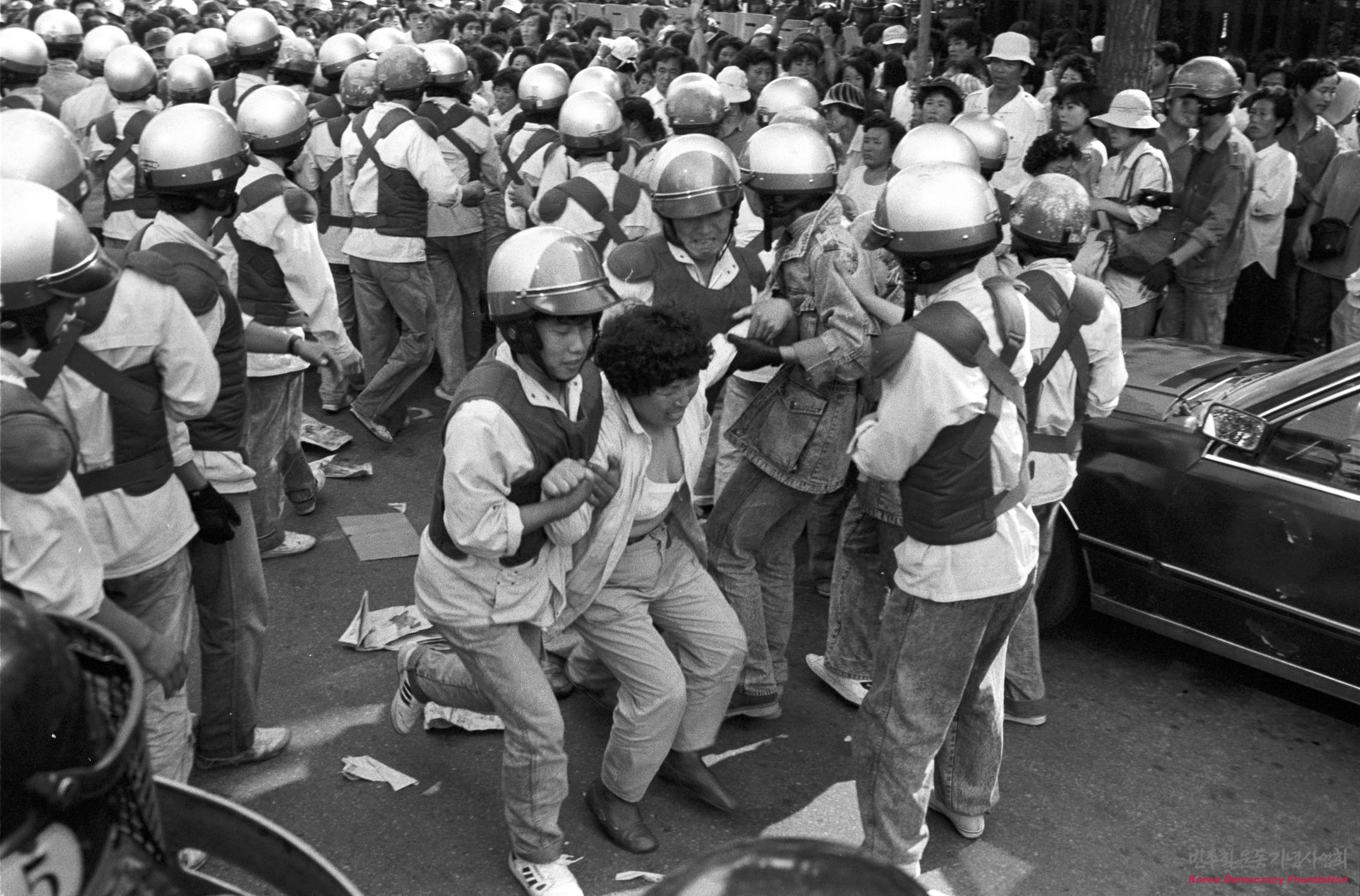 시위 도중 전경들에 의해 연행되고 있는 노점상인 아주머니의 모습