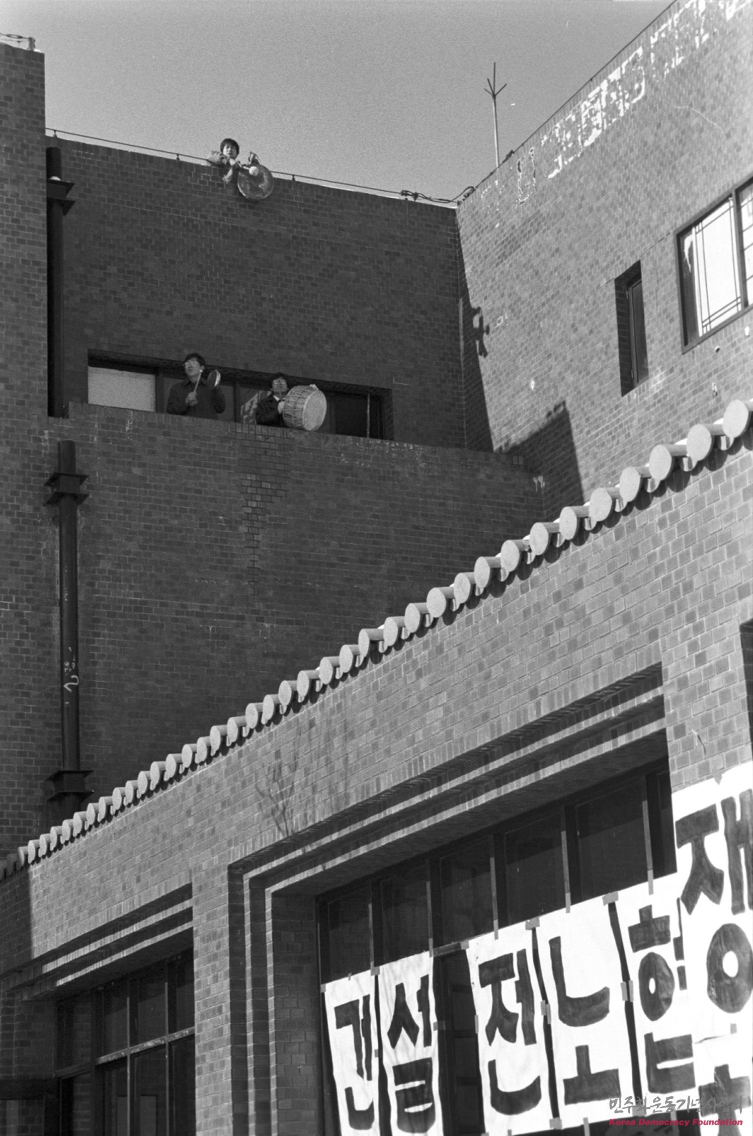 건물 위에서 북과 꽹과리를 치며 시위를 벌이는 노동자들 모습