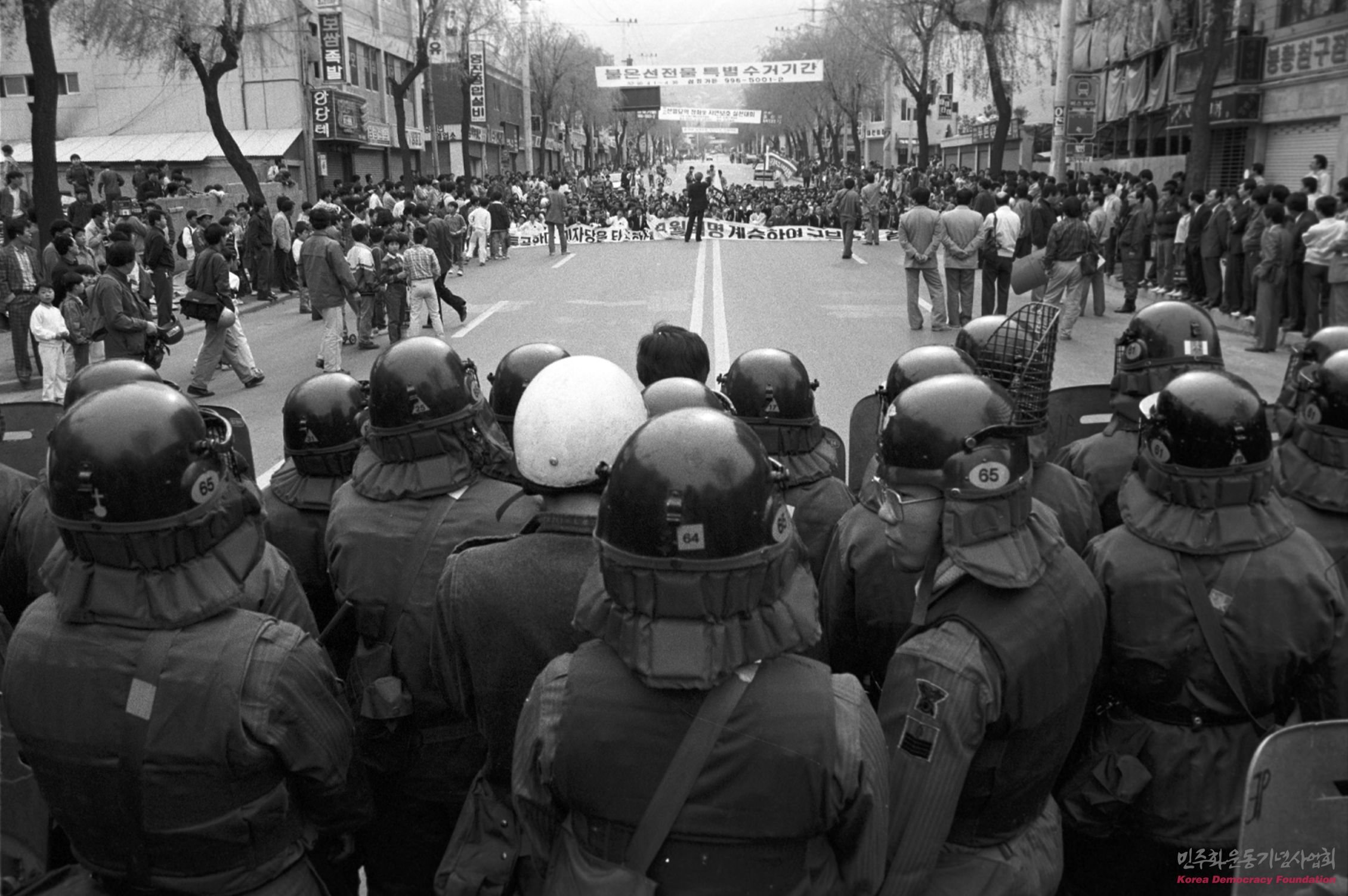 가두시위를 진압하기 위해 배치된 경찰로 인해 도로 한복판에서 대규모 연좌시위를 벌이는 민주세력