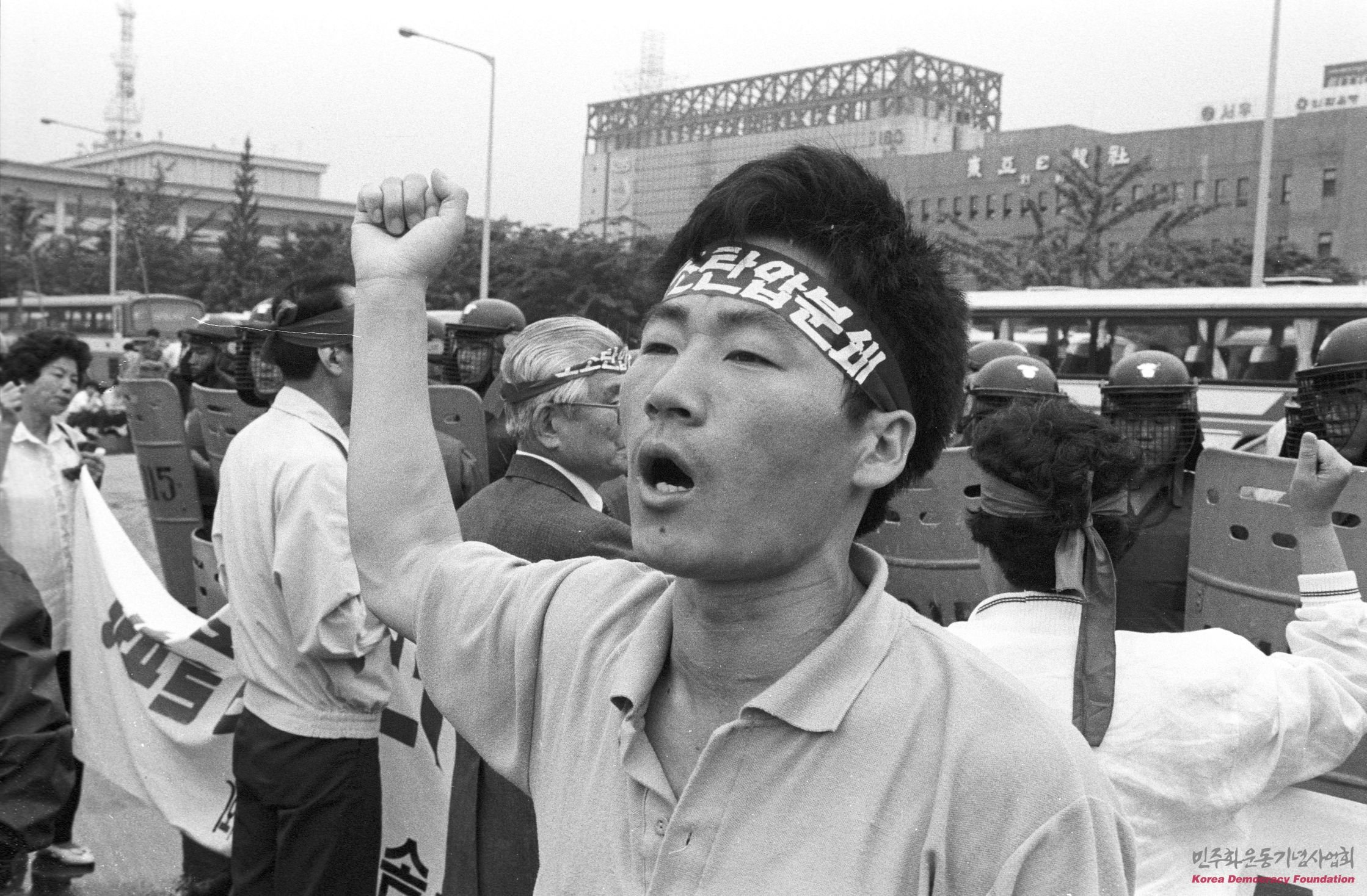 "노조탄압분쇄" 라고 적힌 띠를 머리에 두르고 시위를 하는 사람