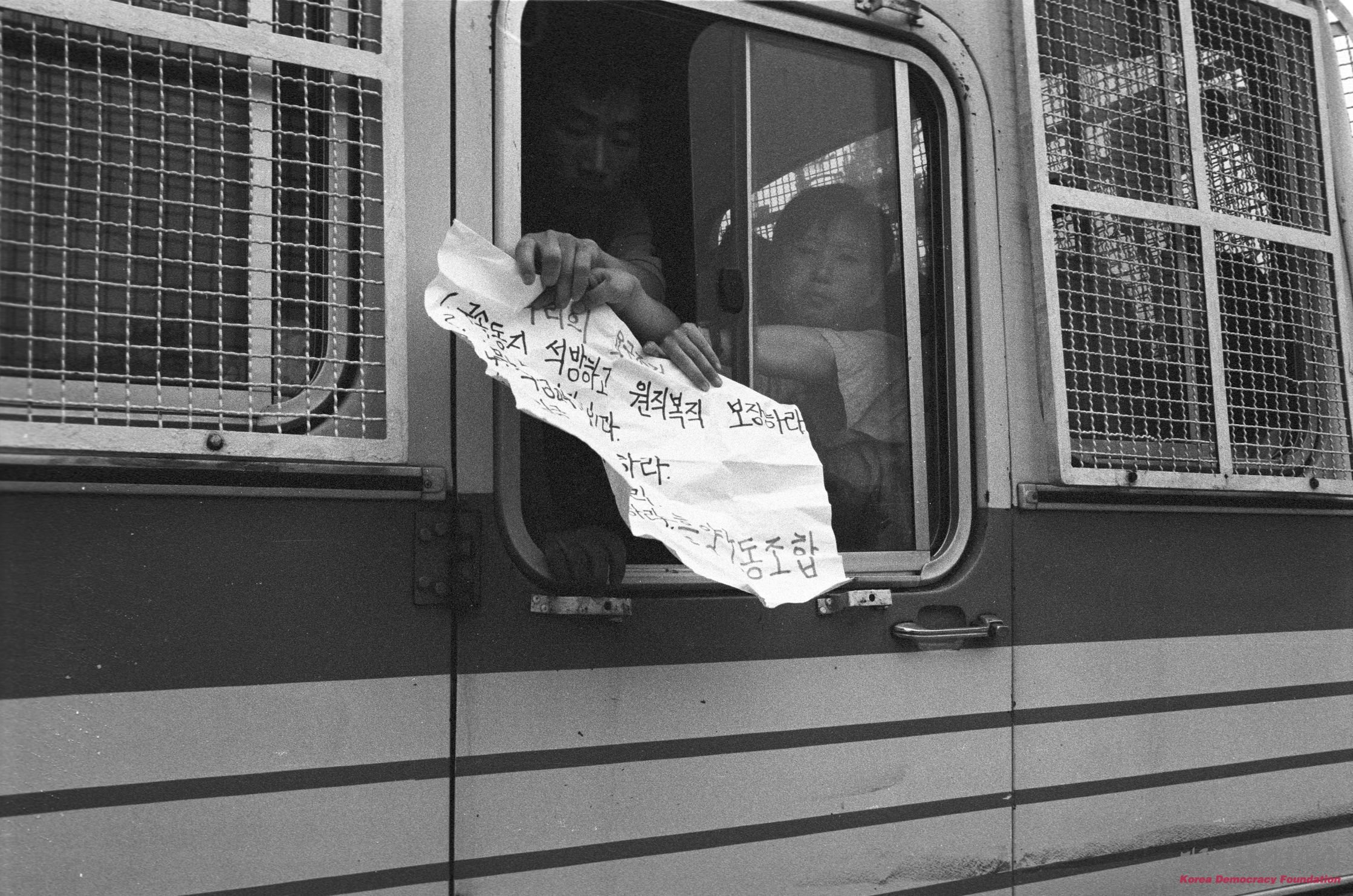 전경차로 연행되는 시위대원이 구속자들을 석방할 것을 요구하는 사항을 적은 종이를 창 밖으로 내보이는 모습