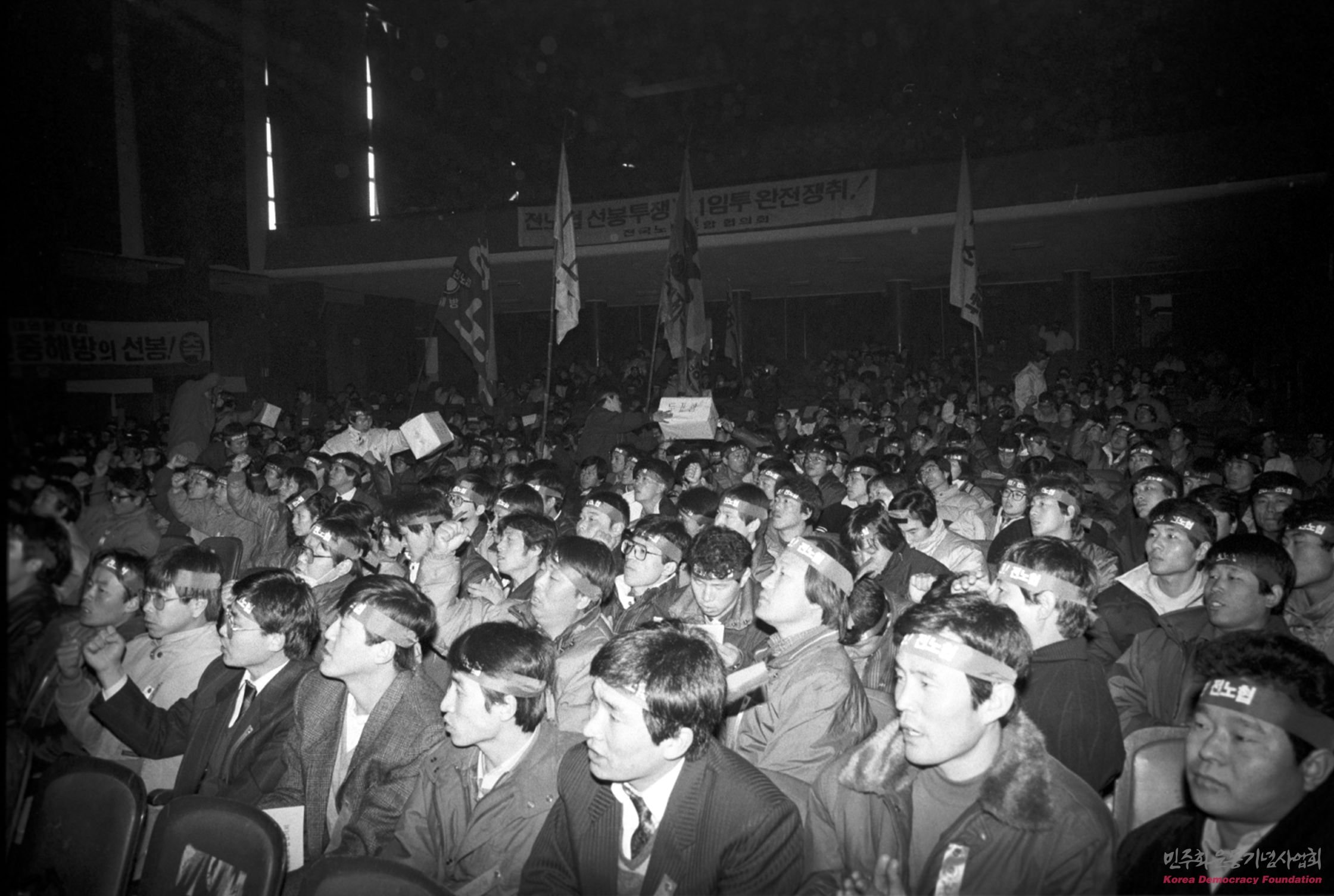 머리에 띠를 두르고 전노협 창립1주년 기념 및 91임투결의대회에 참석한 사람들