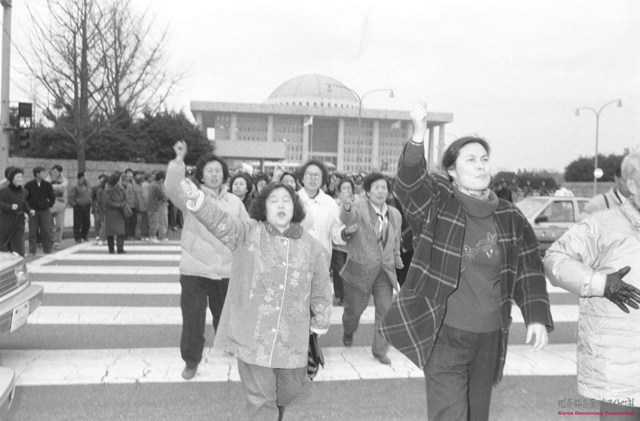국회 앞 횡단보도에서 가두 시위하는 시위대