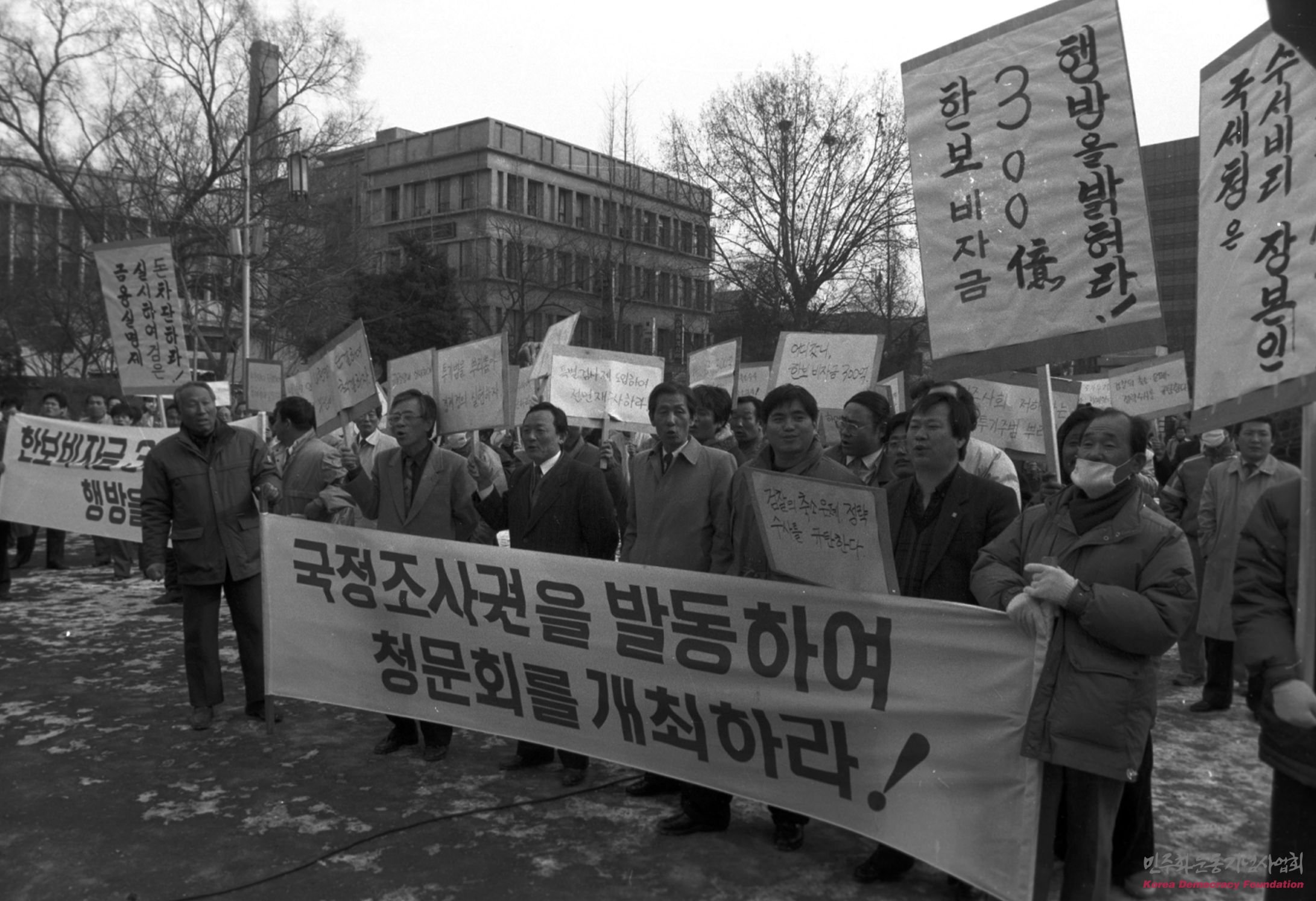 국정조사권 발동하여 청문회를 개최하라는 플래카드를 들고 시위를 하는 모습