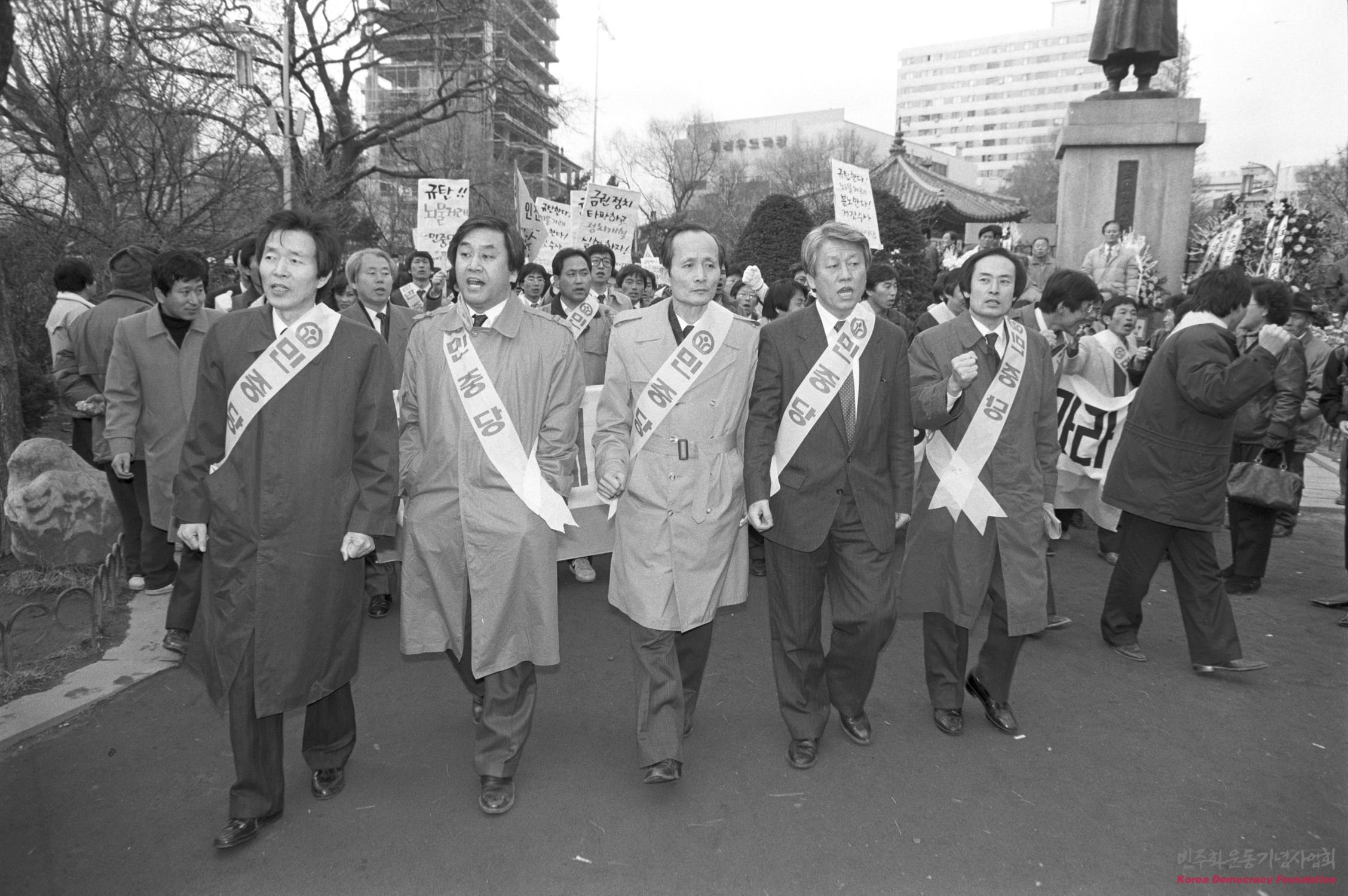 민중당 인사들이 수서비리를 규탄하는 시위에 시민들이 동참하도록 유도하고 있는 모습