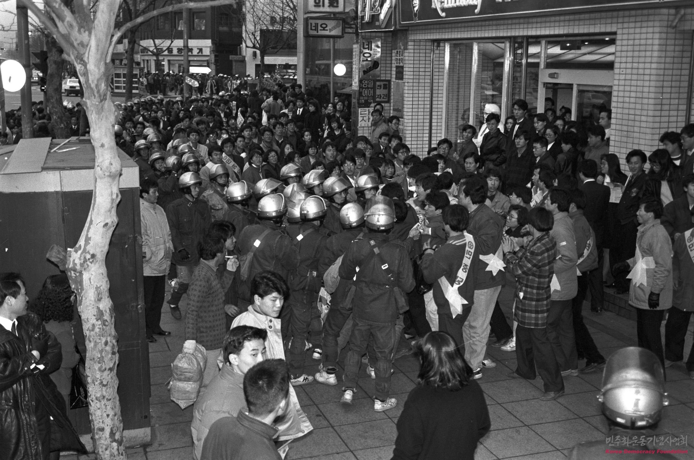 수서비리 규탄시위를 하고 있는 시위대와 대치하고 있는 전경들