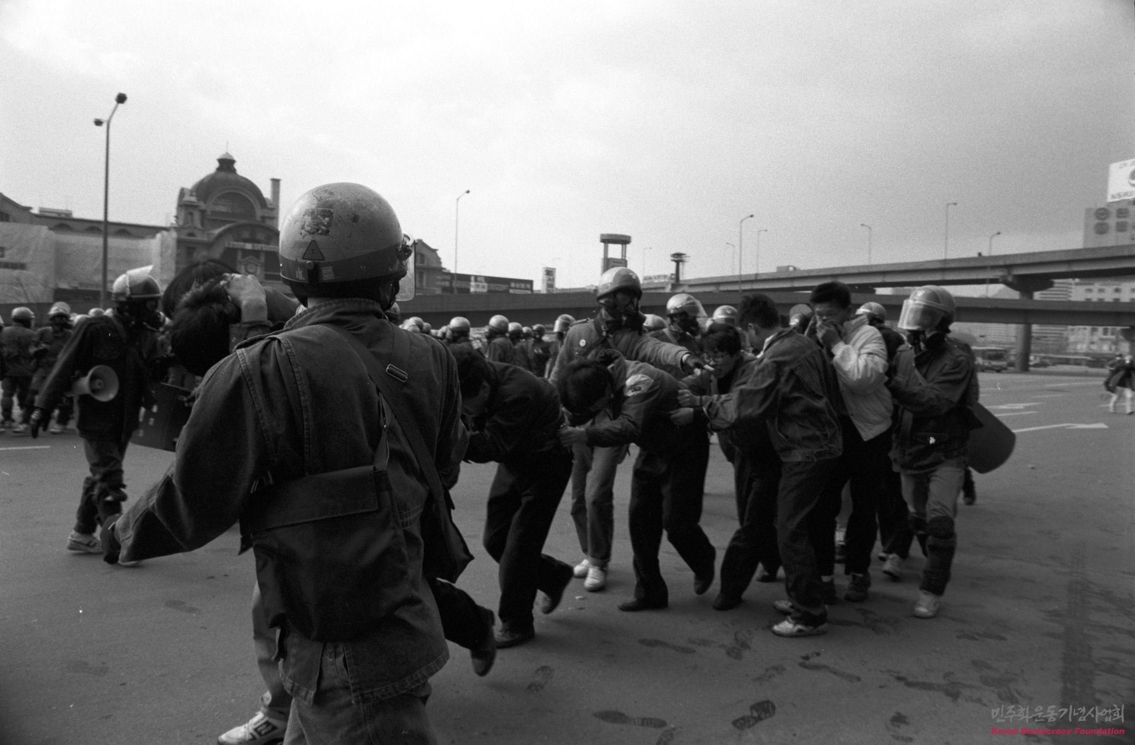 시위대를 일렬로 늘어서게 해서 연행해 가는 전경들