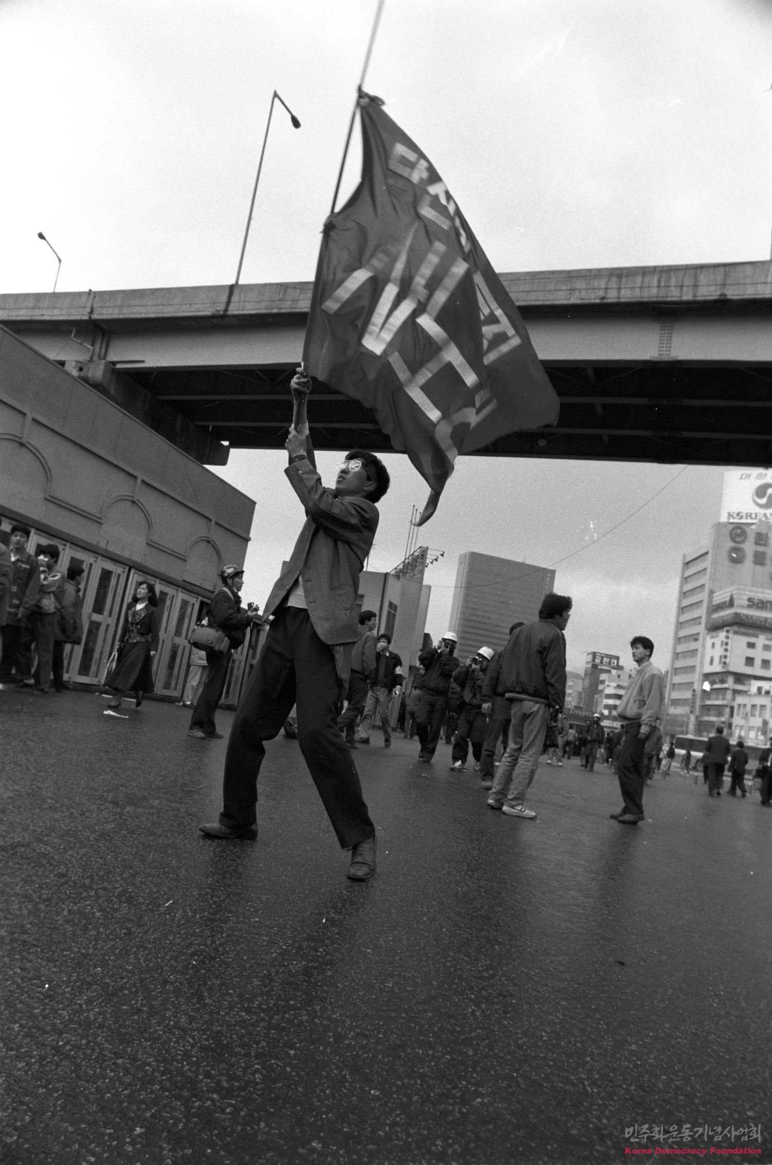 서노협 깃발을 높게 들어올리고 흔드는 남자의 모습