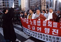 "강철 명지" 라는 깃발을 들고 시위에 참가한 학생의 모습