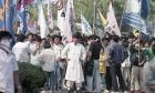 죽은 열사의 영정사진을 들고 노태우 정권을 규탄하는 시위를 벌이는 사람들의 모습